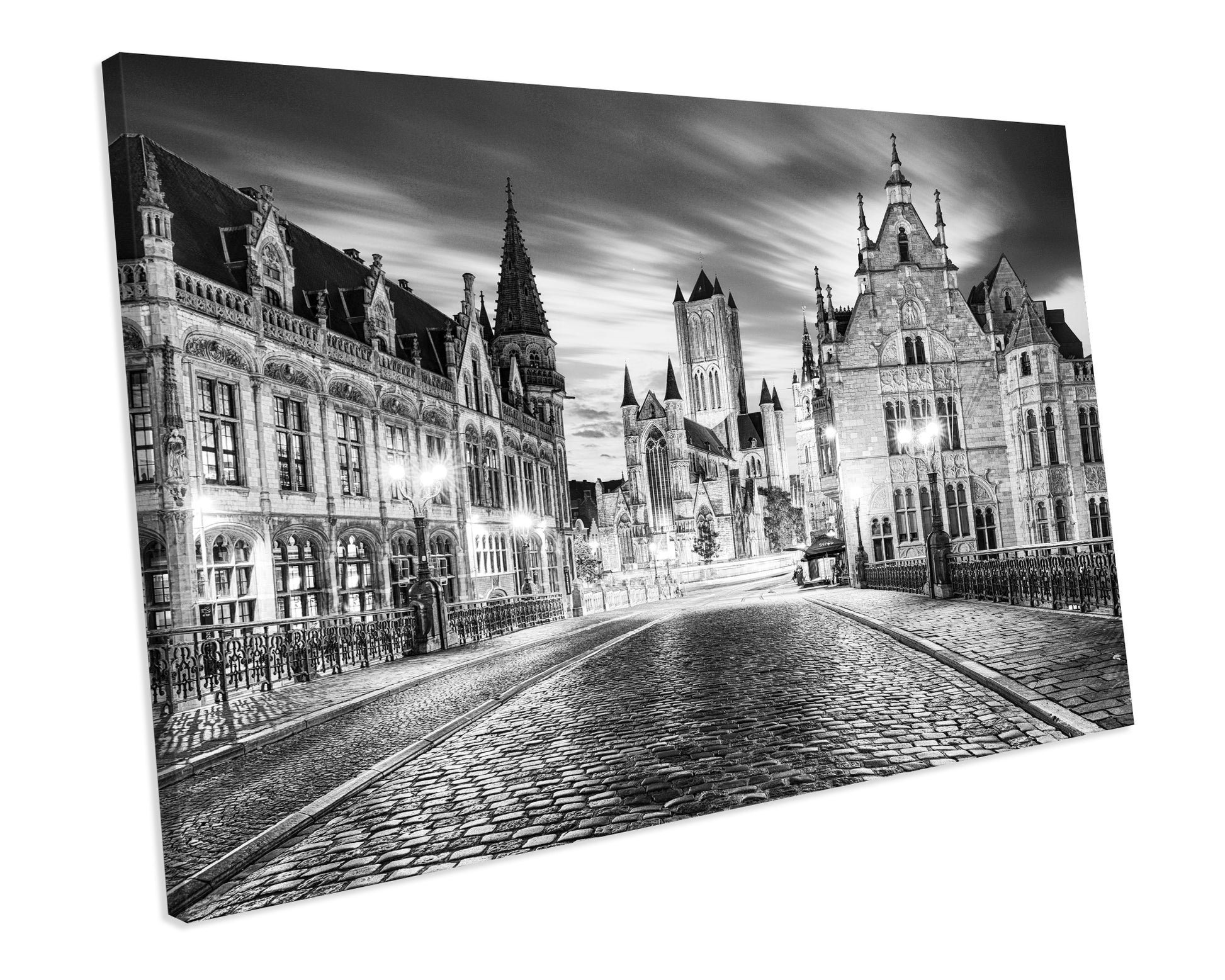 Black & White Medieval Ghent Belgium Cityscape CANVAS WALL ART Box Framed Picture Print