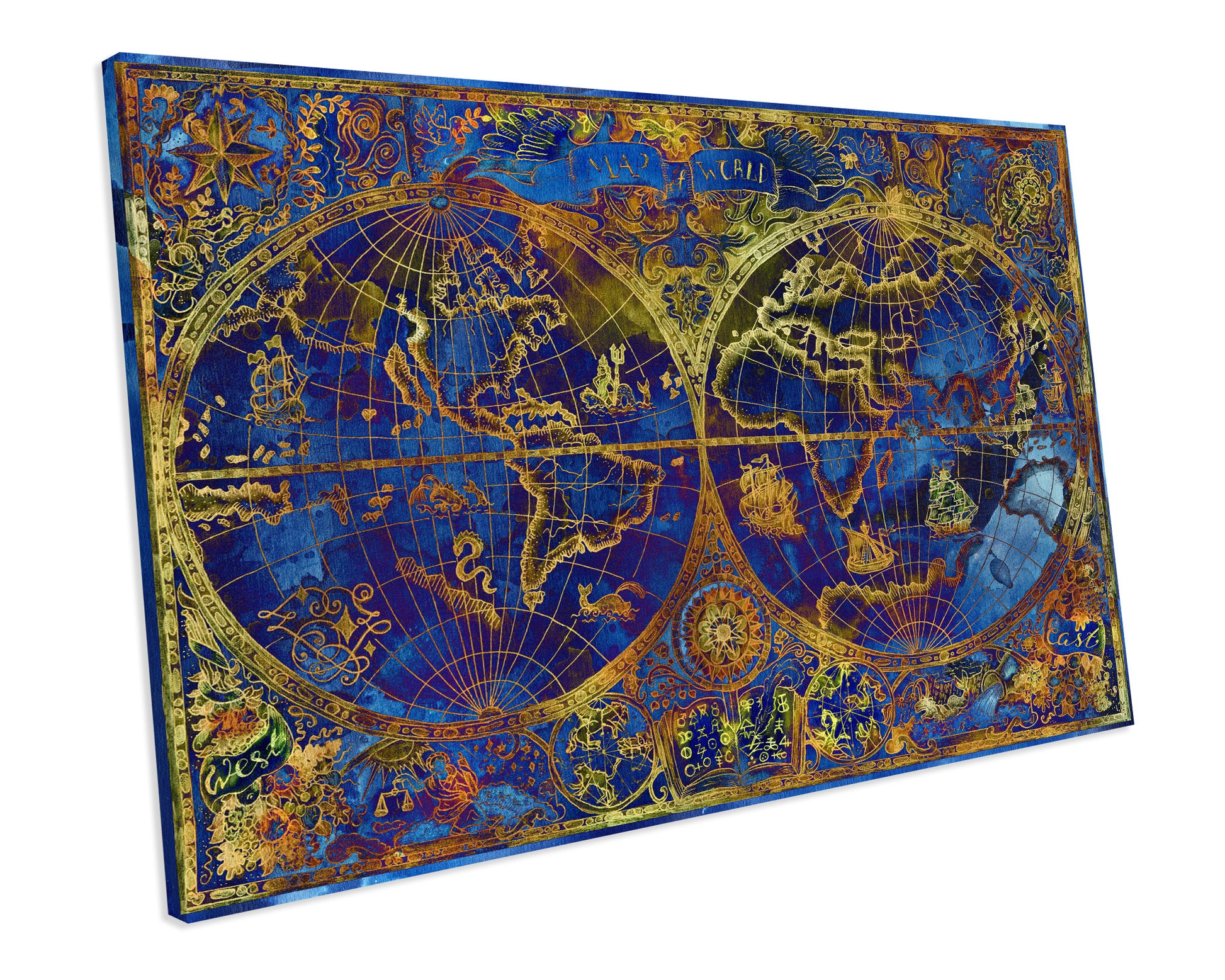 Vintage Gold Map of The World Atlas CANVAS WALL ART Box Framed Picture Print