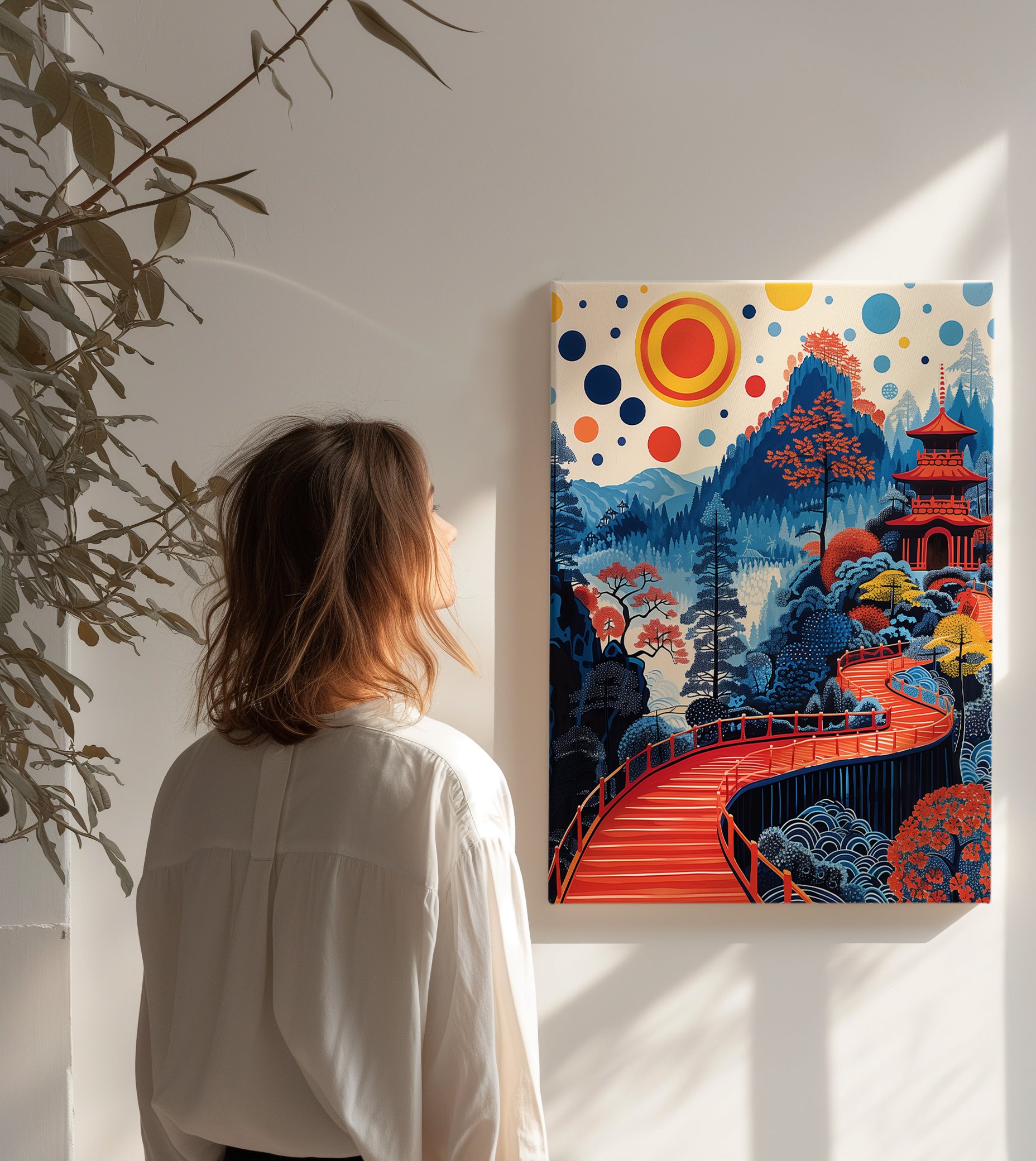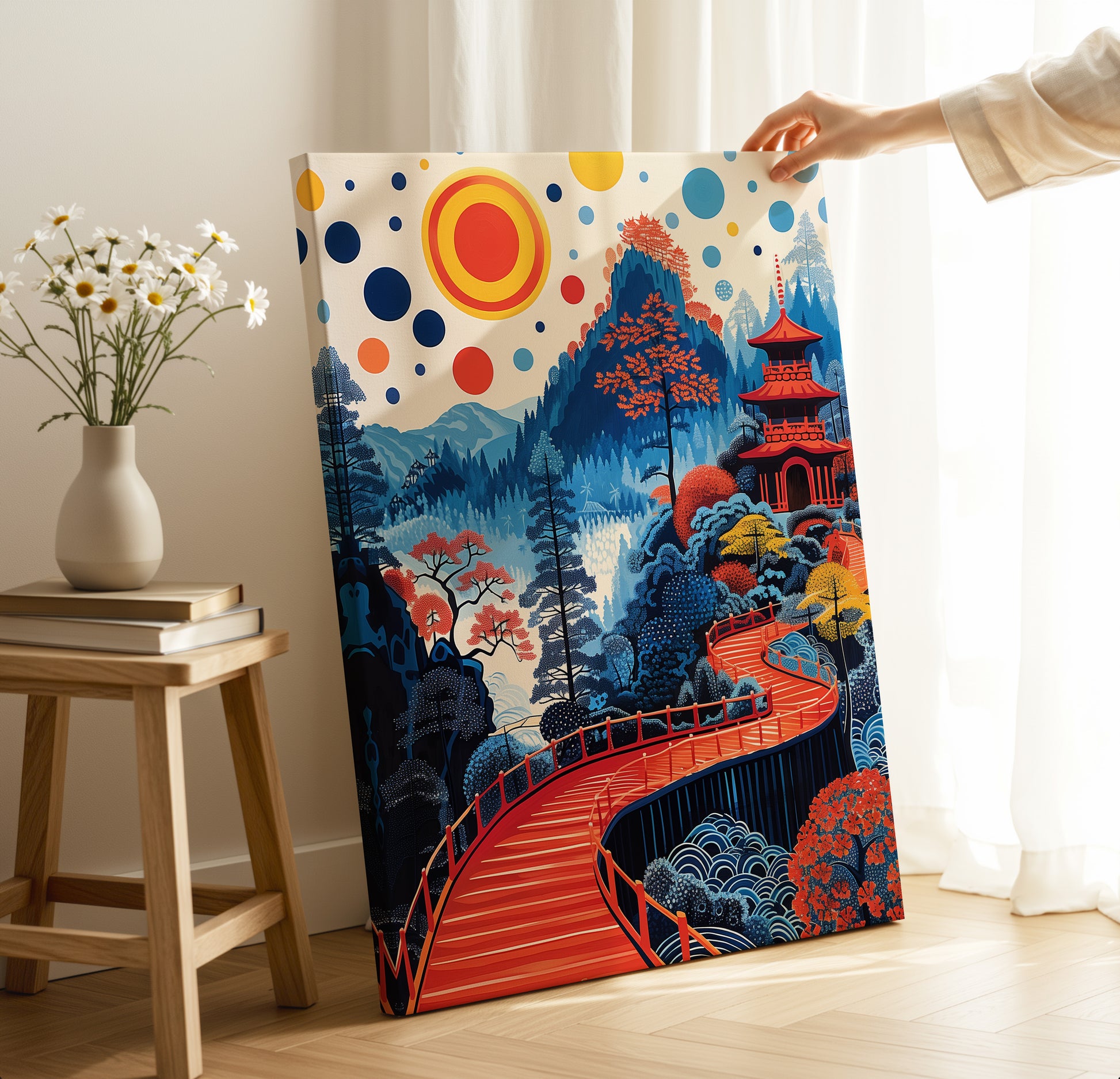 A vibrant canvas print inspired by Yayoi Kusama’s signature style—filled with bold colours, whimsical dots, and dreamlike landscapes that bring modern Japanese art to life.