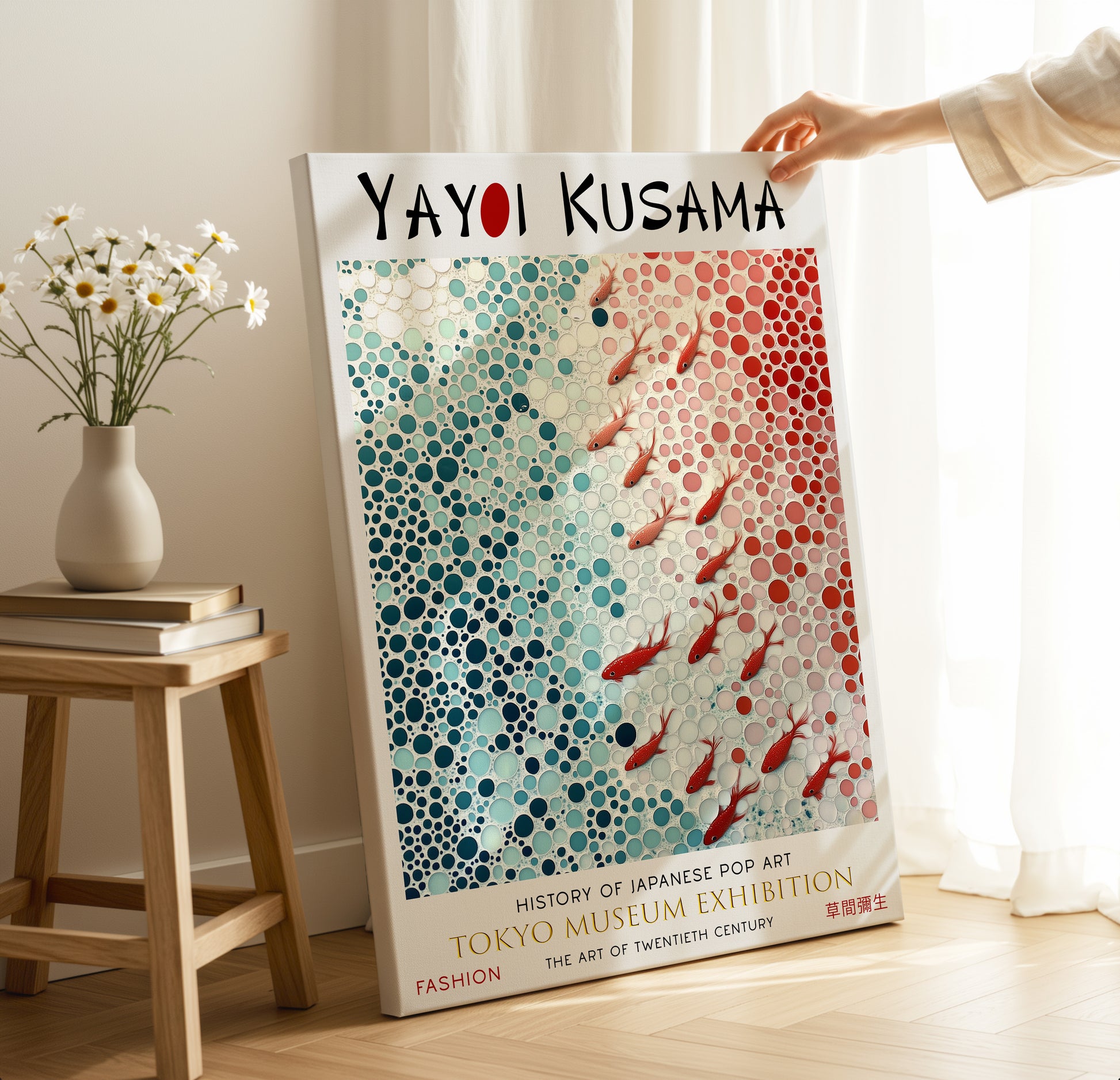 A vibrant canvas print inspired by Yayoi Kusama’s signature style—filled with bold colours, whimsical dots, and dreamlike landscapes that bring modern Japanese art to life.