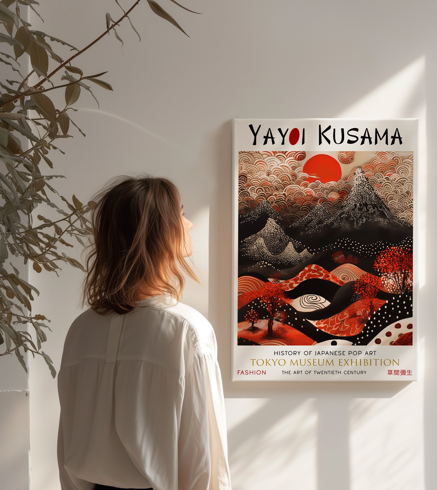 A vibrant canvas print inspired by Yayoi Kusama’s signature style—filled with bold colours, whimsical dots, and dreamlike landscapes that bring modern Japanese art to life.